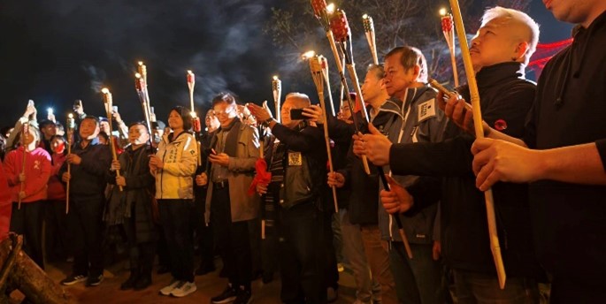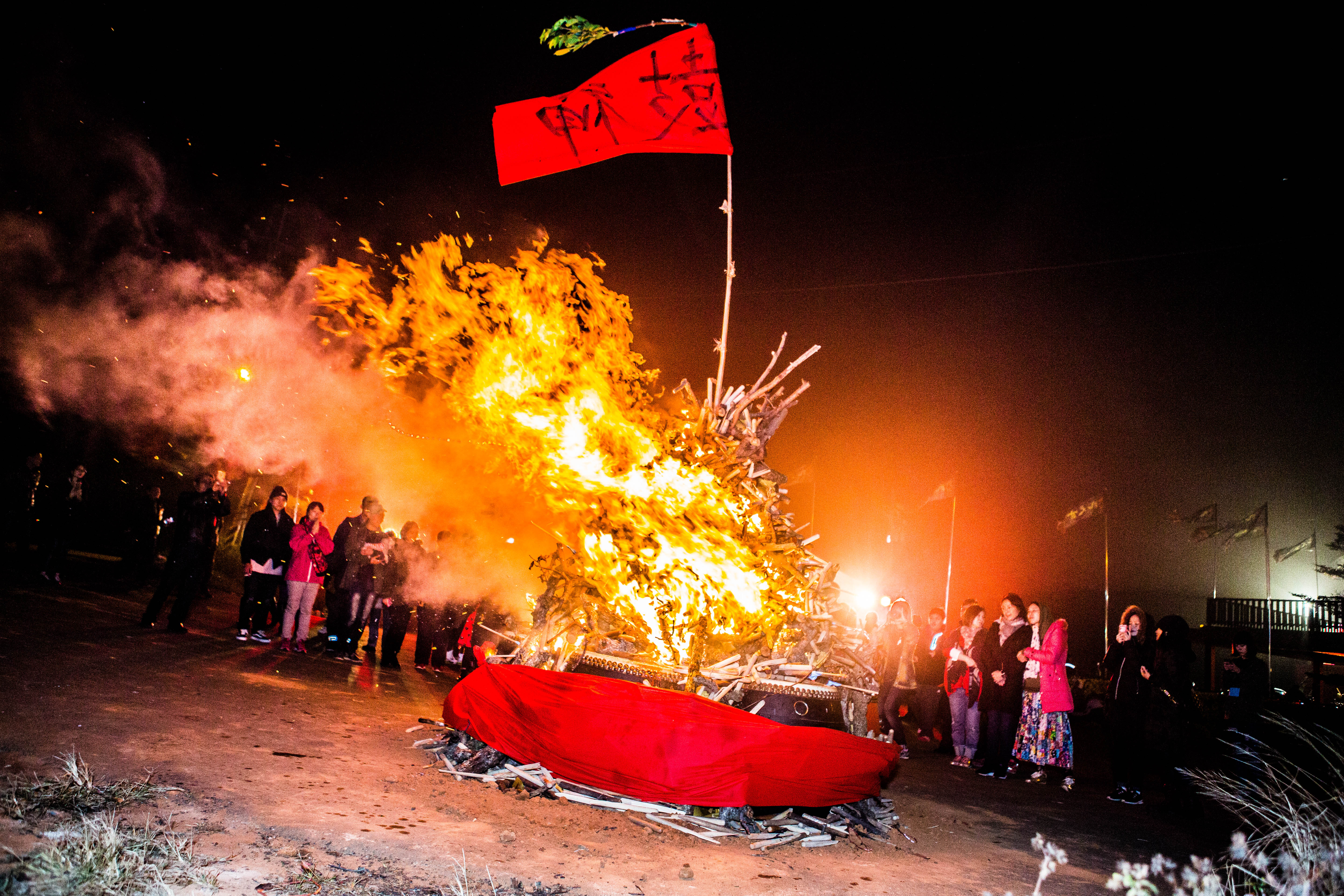 儀式中,火焰逐層吞噬鼓體,火光照耀中彷彿能聽見低沉的轟鳴,如同鼓聲再度迴響;燃燒時鼓棒爆裂的聲音,宛如急促的鞭炮,震落在每一位在場者的心上。四周觀眾合十仰望火鼓山,那一刻,信念在無言之中凝聚。眾人往往在此時思索,一項表演、一種文化,需要多少努力才能被看見,需要多少累積才能堆積成山。